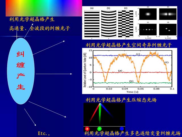 量子光学是当今正在迅速发展的一门学科,研究内容非常广泛。从60年代Glauber定义辐射场的相干特性开始,研究者们相继建立激光场和原子作用的理论模型,实现原子相干捕获、激光制冷、玻色爱因斯坦凝聚、无反转激光、单原子激光等,量子光学取得了令人瞩目的成就。另一方面量子光学的发展为研究量子力学的基本物理问题如定域性、互补性原理、隐变量理论等提供了有力工具,这个有力工具就是量子纠缠态。量子纠缠态的性质一直是量子光学中最基本和最核心的研究内容,所以纠缠态的制备是一项关键技术。第一个用于检测Bell不等式的光子纠缠态是通过Ca40的级联跃迁产生的,由法国Aspect小组在上世纪八十年代完成。后来Yanhua Shih、Z.Y.Ou等人利用晶体中自发参量下转换(SPDC)过程产生了孪生光子对,这种纠缠光子对因为更接近理想的EPR态,后来被广泛应用到量子计算、量子密集编码、量子隐行传态、量子计算等领域。目前这些领域中使用的纠缠光子对主要通过使用双折射非线性晶体(主要是BBO晶体)来产生,尽管这种方法已经非常成熟,但是人们一直在寻求具有新特征的纠缠光子源,特别是能够直接通过非线性参量过程制备的EPR多光子纠缠对(n>=3)的途经。由于在非线性光学领域的出色应用,光学超晶格晶体吸引了很多量子光学领域的研究者们的兴趣。