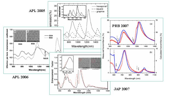 金属表面的周期结构提供了空间倒格矢满足了波矢匹配条件,实现了表面等离激元与入射光的耦合。我们系统研究了不同小孔阵列的对称性、倒空间的傅立叶分量、以及阿基米德阵列对光透射性能的影响。而且详细探讨了表面等离激元在增强透射中扮演的角色。